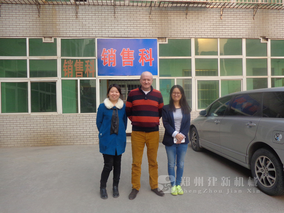 2014年11月,來自俄羅斯的客戶來到鄭州建新公司簽訂了兩套時產120方混凝土攪拌站設備的大訂單,下圖為建新公司銷售部劉經理、經理帶客戶參觀建新公司的生產車間及成品貨場。